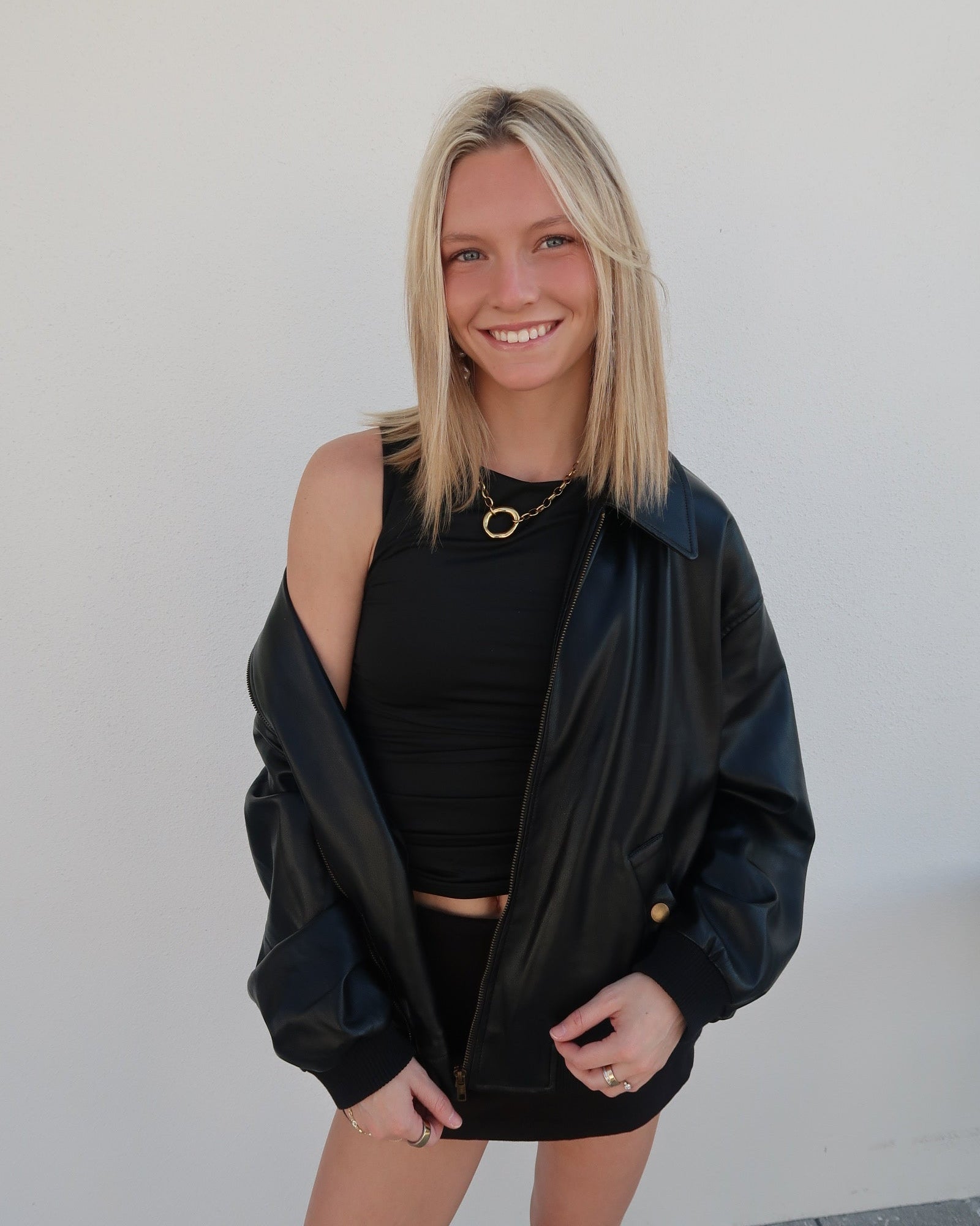 A sleek, oversized leather bomber with a modern, softened edge. This jacket blends structure with ease—featuring a smooth matte finish, relaxed drop shoulders, and ribbed cuffs for that true bomber feel. The zip-front design and subtle gold hardware add just the right touch of polish. Versatile enough to throw on over athleisure or elevate a simple mini skirt, it’s the ultimate cool-girl staple for fall and winter.