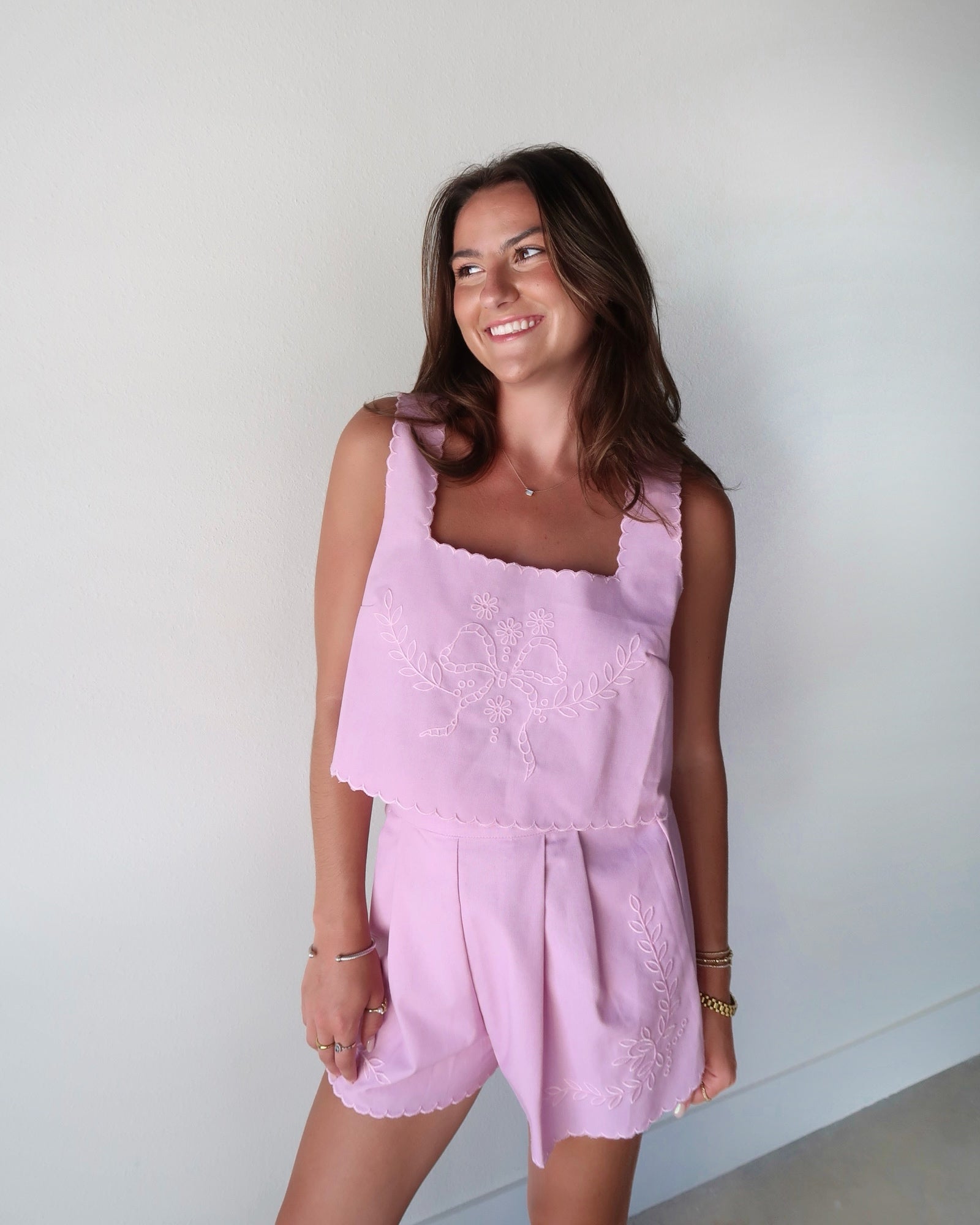 Sweet meets seaside in the Blush Scallop Set. This pink two-piece features delicate scalloped hems, floral embroidery, and a dainty bow detail on the front—giving it the perfect mix of playful and polished. The lightweight fabric keeps things breezy, while the intricate stitching adds just the right touch of charm. Whether you're lounging beachside or heading out for golden hour drinks, this set is your new warm-weather favorite.