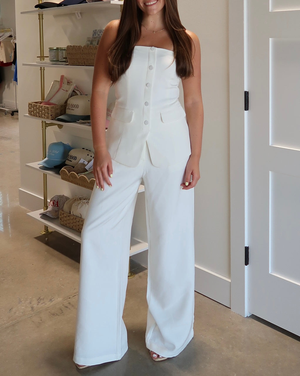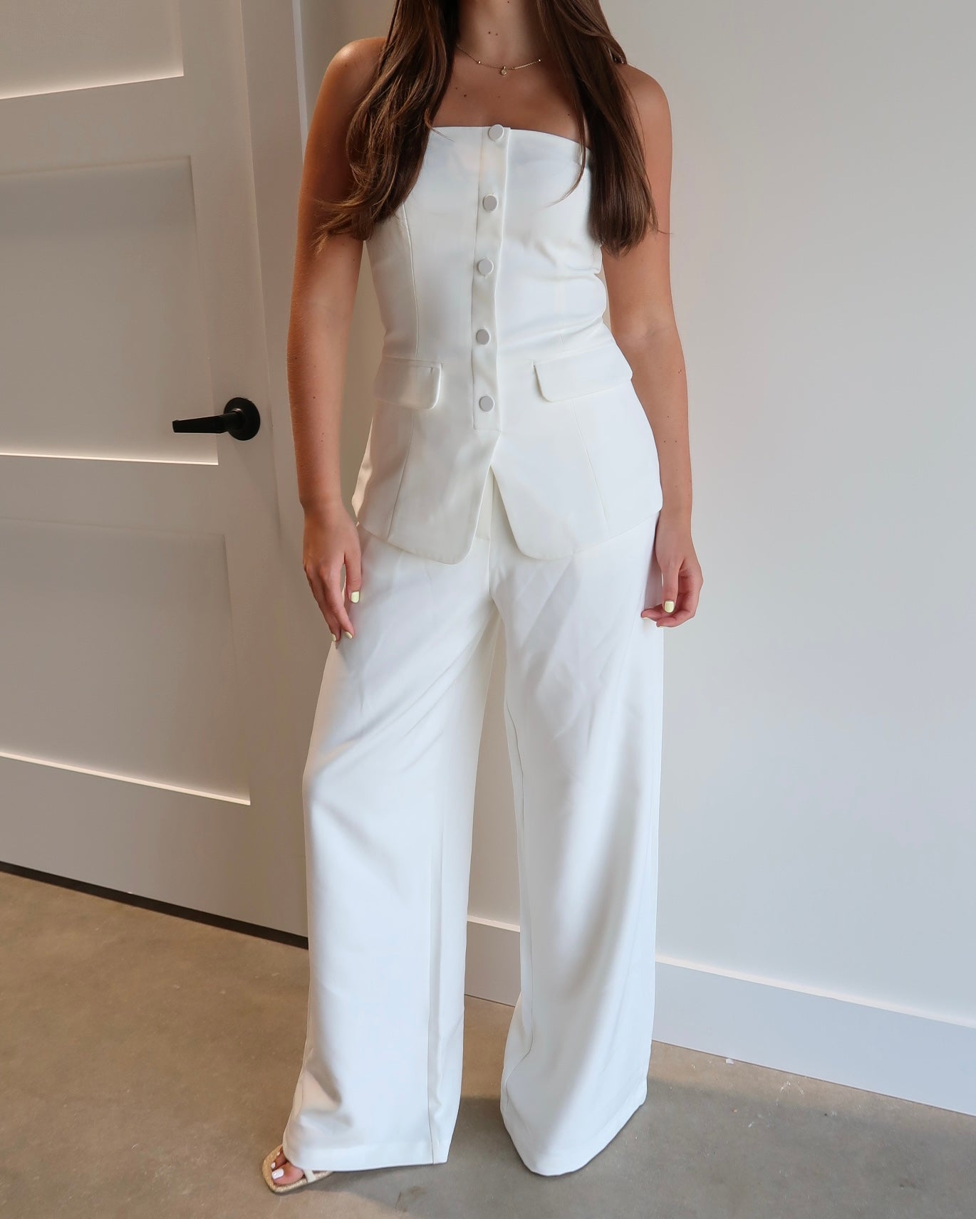 Polished and powerful, the Ivory Executive Set features a sleek strapless top with a button-up front, paired with tailored business pants. The top's structured design offers a sophisticated yet modern silhouette, while the classic pants provide the perfect balance of professionalism and comfort. Ideal for business meetings or office events, this set brings a fresh and refined approach to professional dressing.