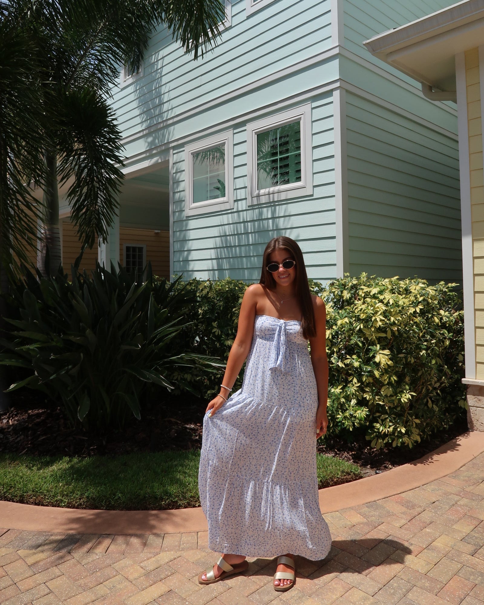 A breezy, tiered maxi dress with dainty blue florals and a front-tie bodice—this flowy favorite is made for sunlit strolls and salty air.