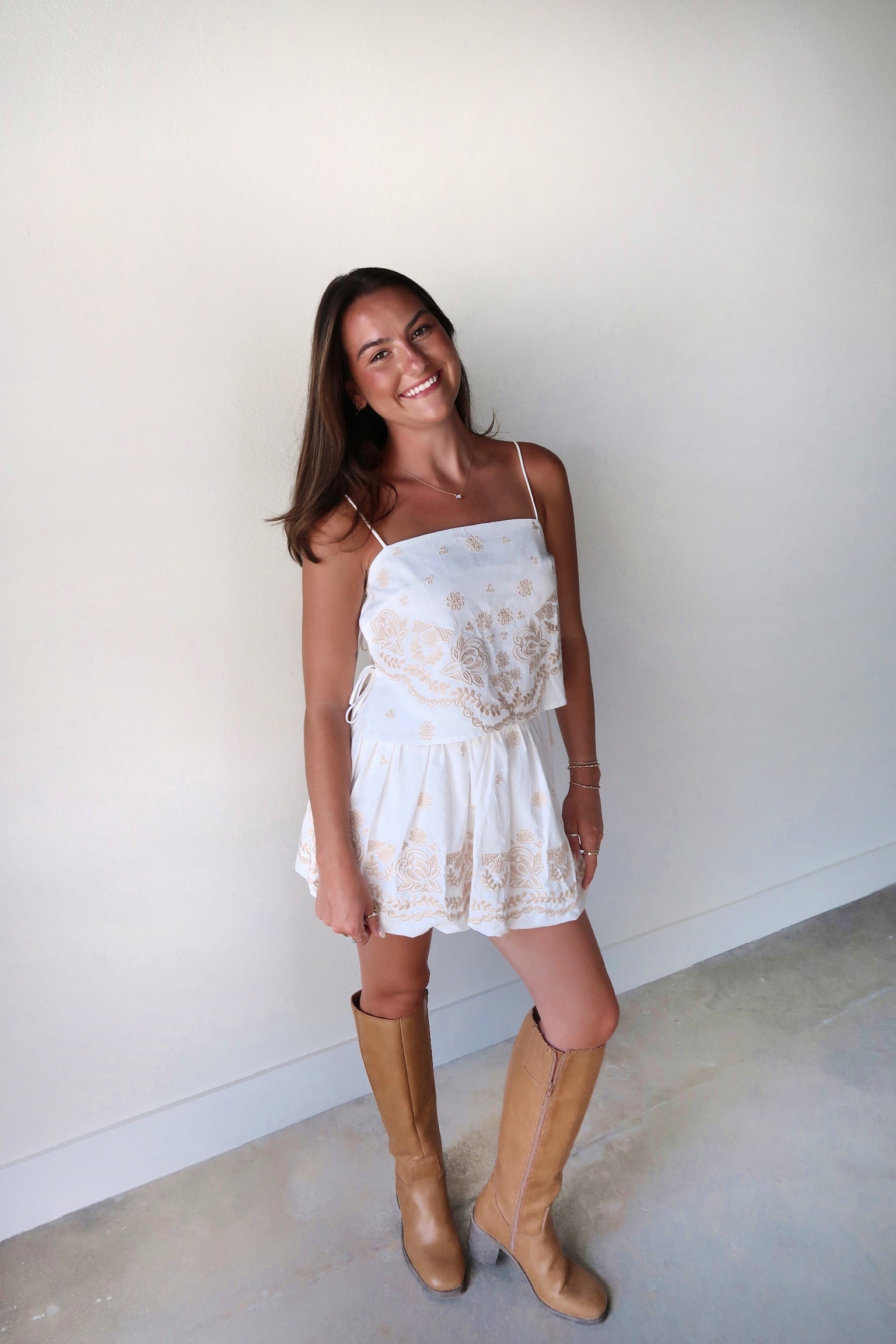 The ultimate set for sun-soaked days and golden hour strolls. The Sandshell Set features a crisp white top and matching skirt, both adorned with delicate brown embroidery that gives just the right touch of earthy detail. Side ties on both pieces transform into playful bows—adding a flirty, feminine finish. Lightweight, breezy, and effortlessly elegant, this set is made for sandy toes, salty air, and slow mornings by the sea.