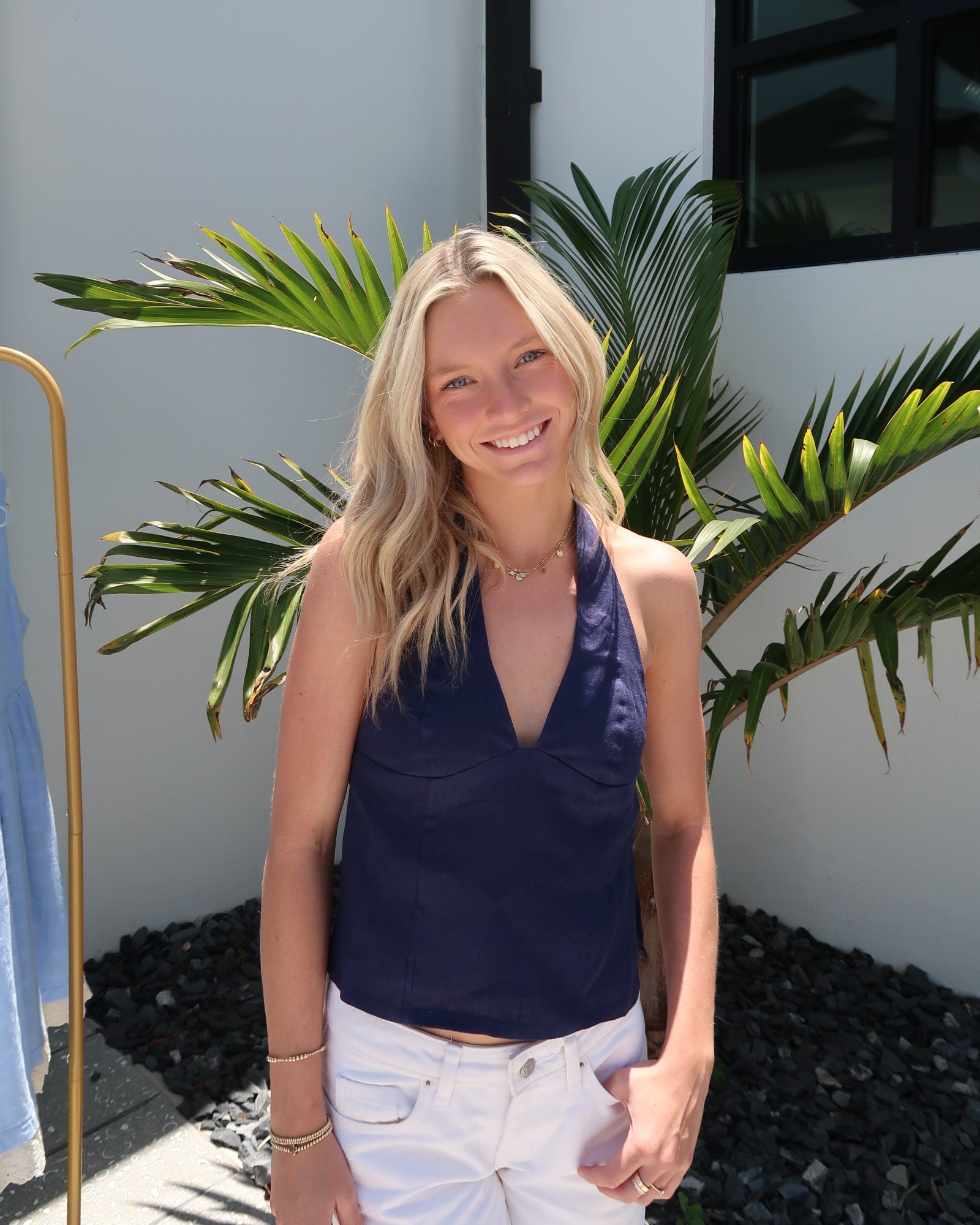 Your new go-to for sunny days and salty air. Featuring a flattering deep V neckline and a sleek, tailored fit, this navy blue beauty is crafted from a lightweight, breathable fabric that keeps you cool and effortlessly chic.
