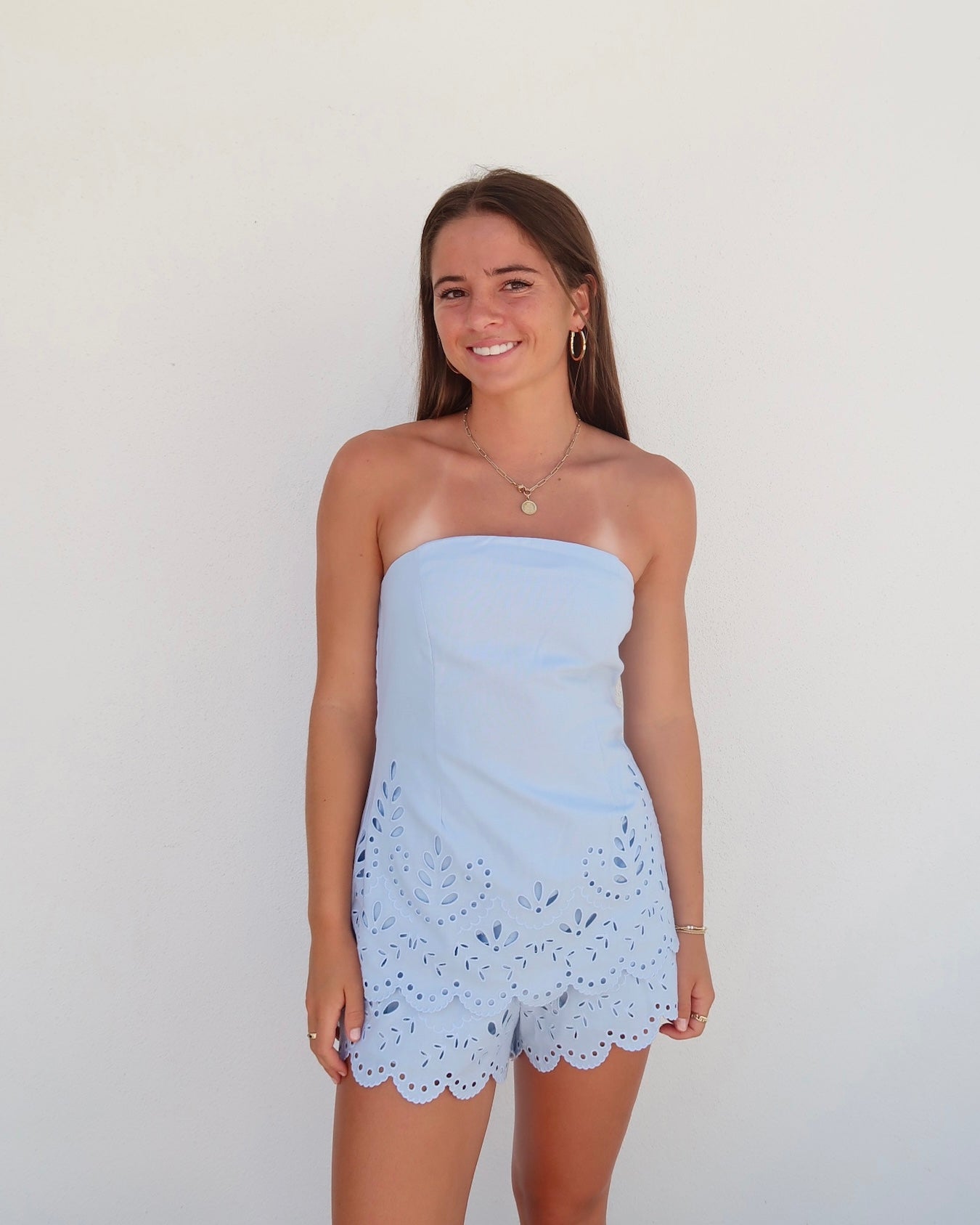 Breeze through summer in the Sunset Scallop Set — a dreamy strapless duo that’s all about effortless charm. The bandeau-style top and matching shorts feature delicate scalloped hems that add a soft, feminine touch. Available in a creamy sand and breezy light blue, this set is perfect for barefoot beach walks or sun-soaked brunches. Style it with simple gold jewelry and your favorite sandals for an easy, elevated look.
