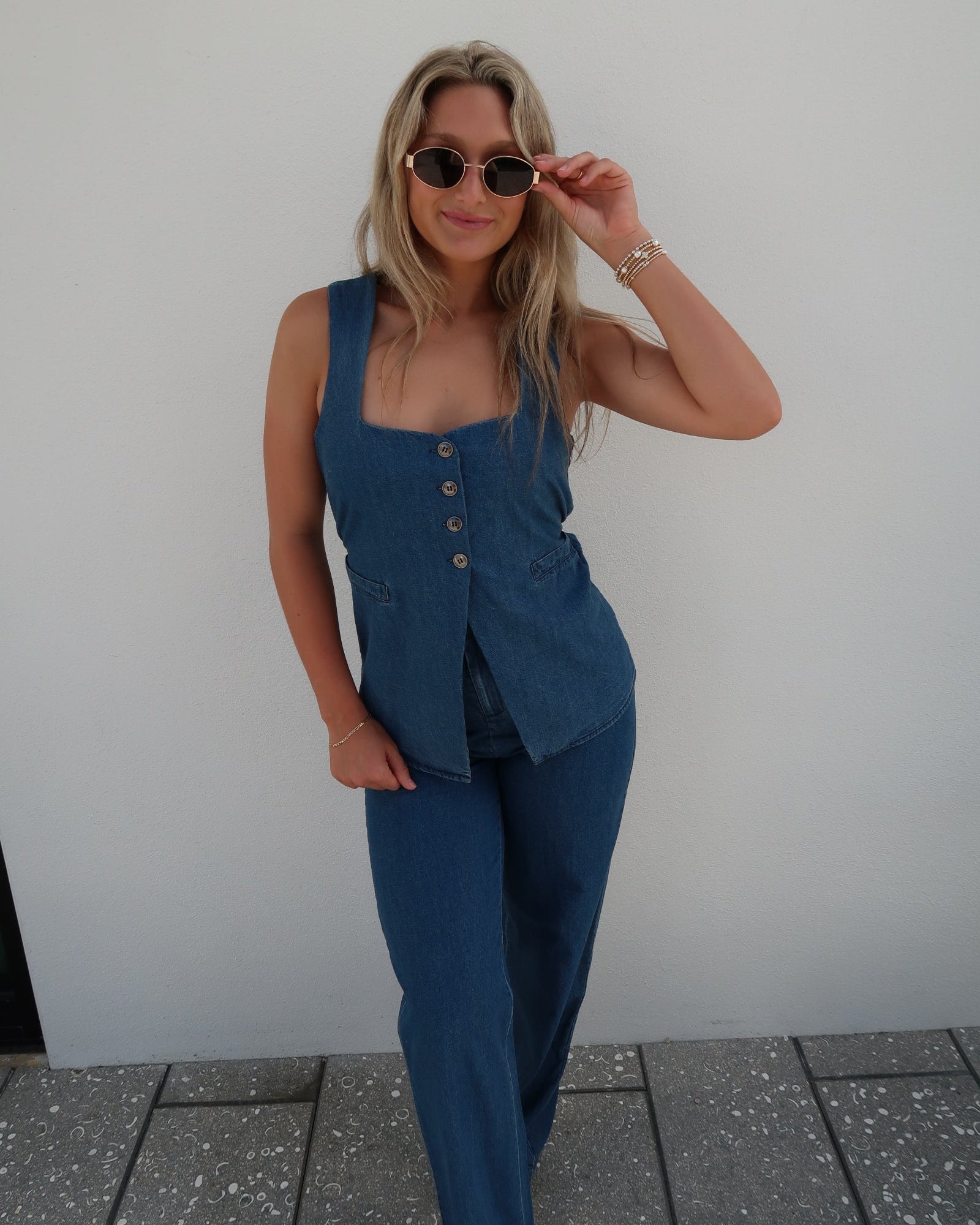 Timeless with a modern twist, the Coastal Muse Set pairs a structured denim vest top with matching wide-leg jeans for a sleek, all-denim statement look. Featuring a flattering square neckline and button-front detail, this set brings effortless confidence — perfect for sunlit strolls or casual evenings by the water.